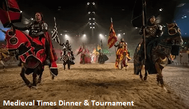 A atração gastronômica mais popular da América do Norte convida os visitantes a viajar de volta ao século 11 e embarcar em uma viagem inesquecível! No Medieval Times Dinner & Tournament, seis cavaleiros competem para se tornarem campeões em um torneio de justas e perigosas lutas de espadas, enquanto os convidados desfrutam de um banquete de quatro pratos no verdadeiro estilo medieval sem talheres, enquanto torcem por seu cavaleiro para a vitória.
